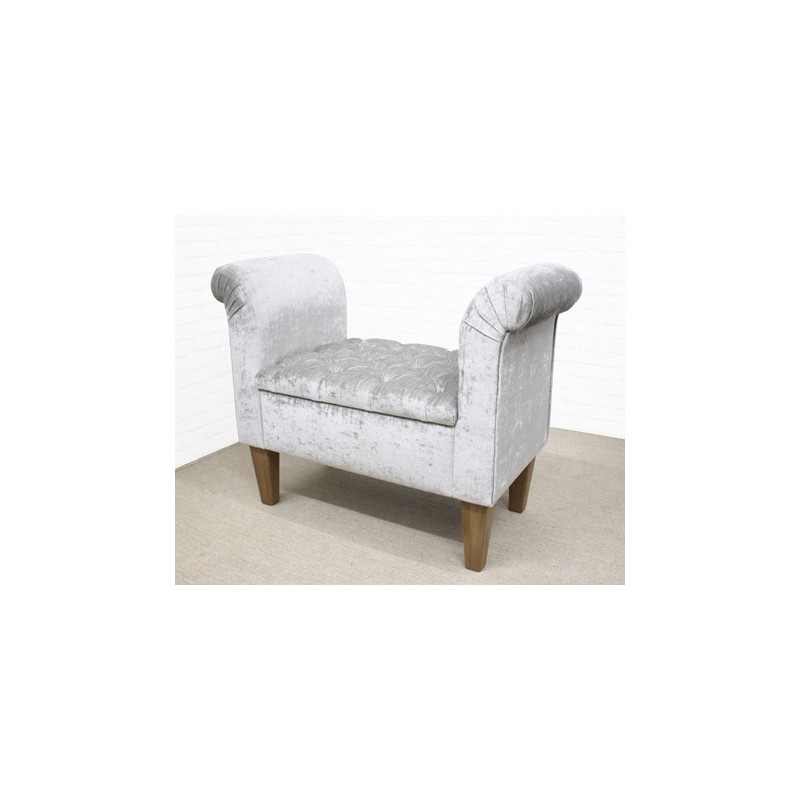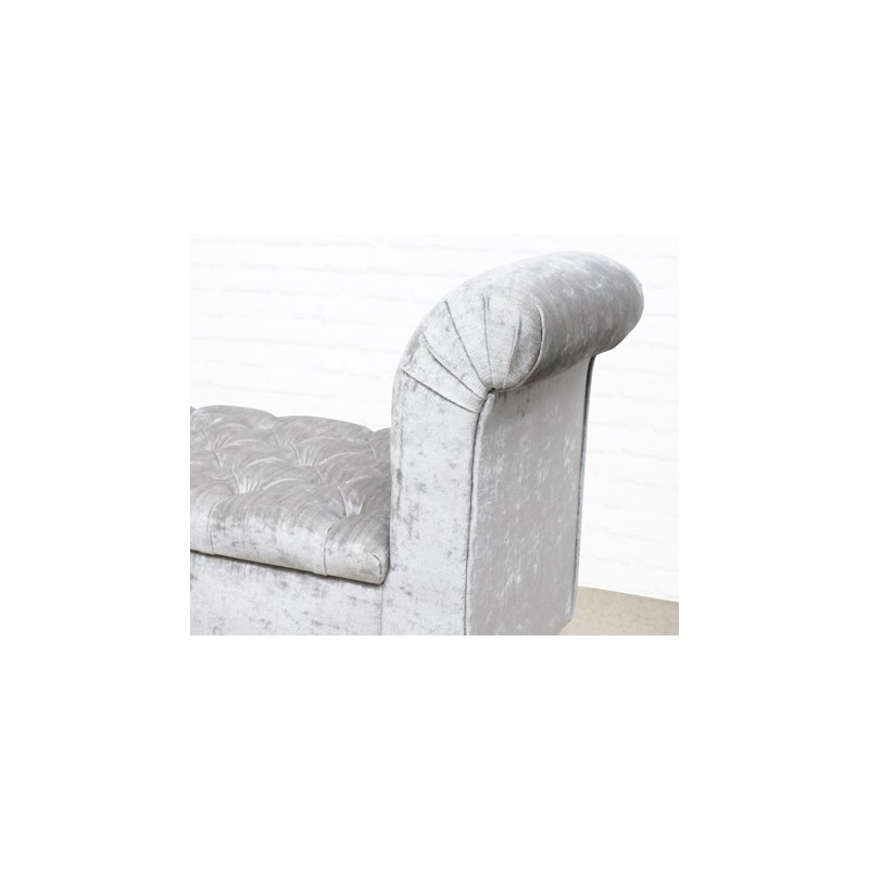 An elegant and sophisticated deep buttoned bench, with scroll arms. Ideal for a hallway entrance or for the end of a bed. Handmade to order. Arm height finishes at 28 inches or can be made to a bespoke height.