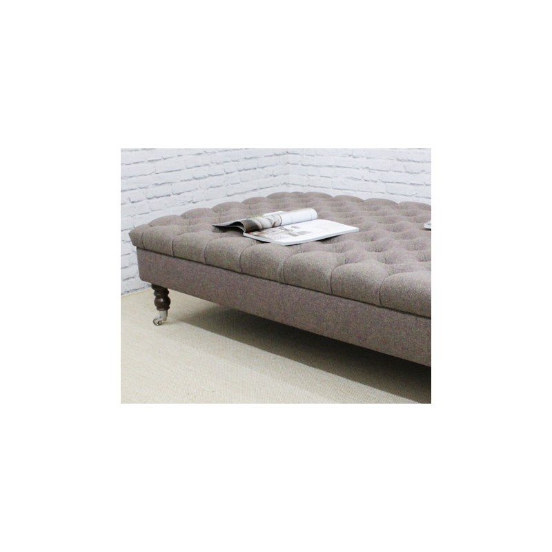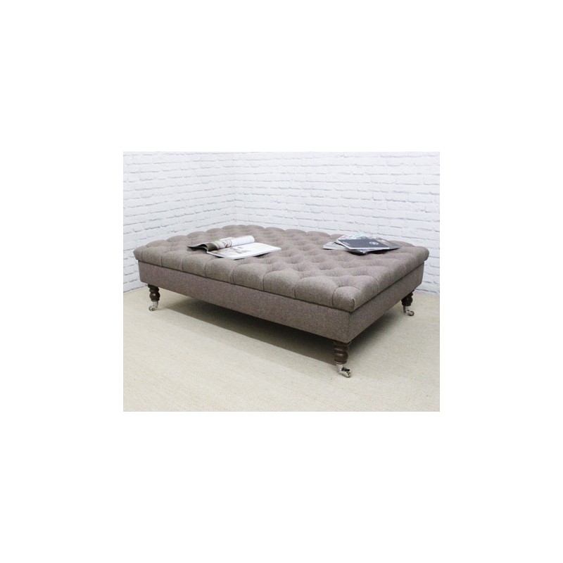 An elegant deep buttoned rectangular stool with top and short base section detail. Enjoy using as a footstool, coffee table, games table or occasional seat in any setting. Shown with bespoke legs.