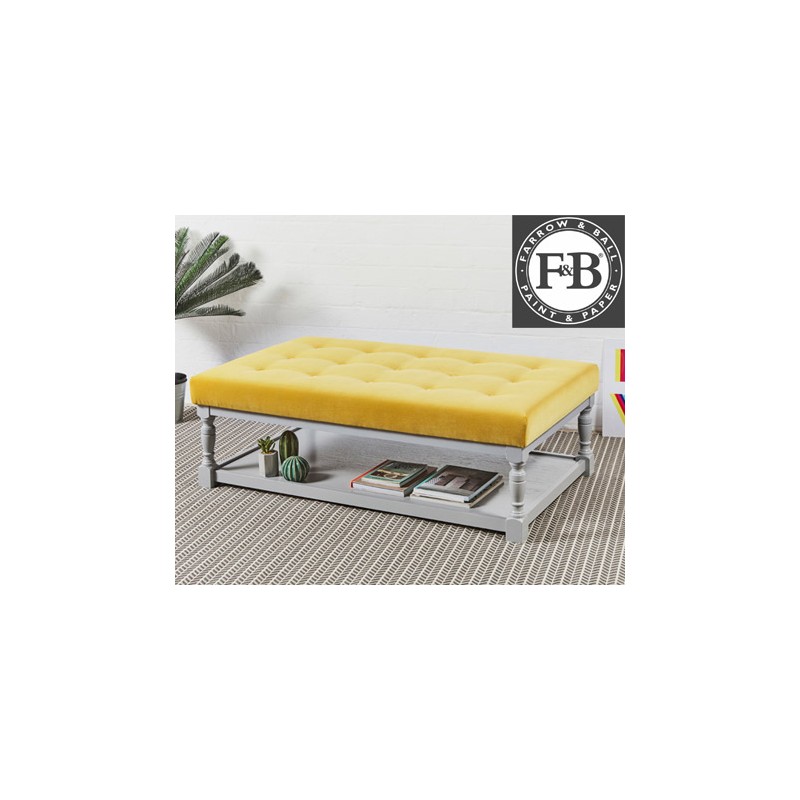 A stunning Oak framed coffee table stool with turned legs and a useful shelf for books/magazines. A padded, shallow buttoned top and smart piping detail finish the piece. Handmade in the UK and finished in a range of colours. Shown in Manor House Gray Farrow & Ball, any colour available. Select the frame colour and fabric or leather choice below.