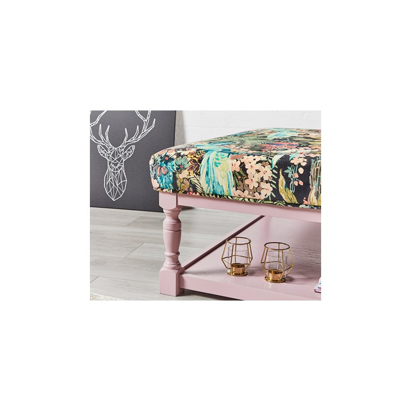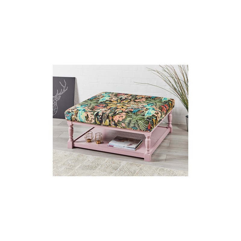 A stunning Oak framed coffee table stool with turned legs and a useful shelf for books/magazines. A padded, plain top and smart piping detail finish the piece. Handmade in the UK and finished in a range of colours. Shown in Farrow & Ball Cinder Rose, with Linwood Rainforest Rabble Velvet in Neon. The cost shown excludes fabric though we can help to source a range of fabrics.